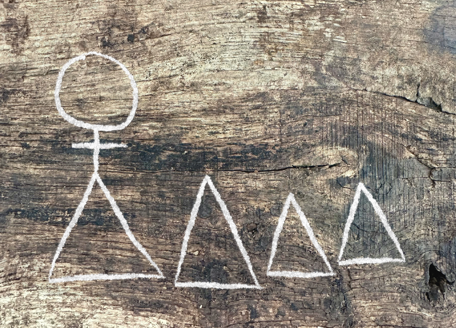 Signs could be combined. For example the stick figure with the triangles that means “Kind woman lives here, tell pitiful story” is actually a combination of two symbols, the stick figure “Kind woman” and the triangles, which mean “tell pitiful story.”