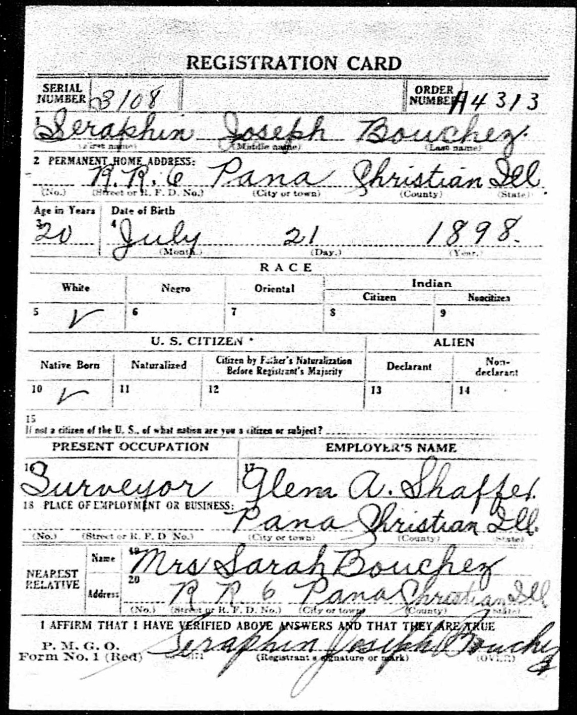 Oddly, out of the 40 classes required for this course, the receipt for the surveying module was the only one missing. Then, through research, I found his 1918 WWI draft card. There his occupation is listed as—surveyor.