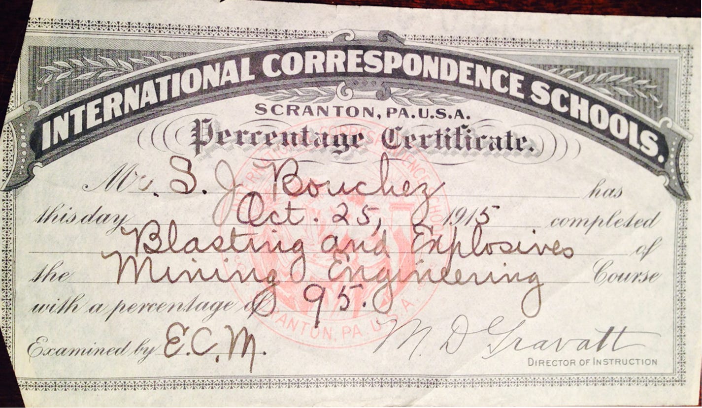 At that time, the best way to get that education was through the International Correspondence School, a pioneer in distance education founded in 1909. In 1914, at age 16, he undertook the certificate program for Mining Engineering. The hope was that it would allow him to become a foreman at the mine and not have to spend so much time in the pit.
